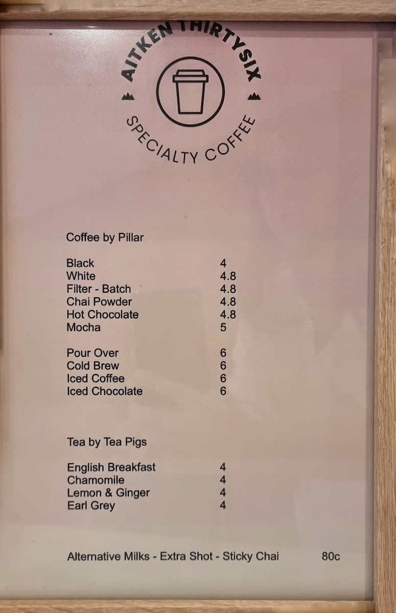 The menu at Aitken ThirtySix offers a selection of beverages and light food options suitable for breakfast, coffee breaks, and casual dining. Visitors can choose from a range of coffee drinks crafted with beans by Pillar, including variations such as black coffee, white coffee, filter batch brew, chai powder, hot chocolate, mocha, pour over, cold brew, iced coffee, and iced chocolate. This range covers both hot and iced beverages to suit different preferences.